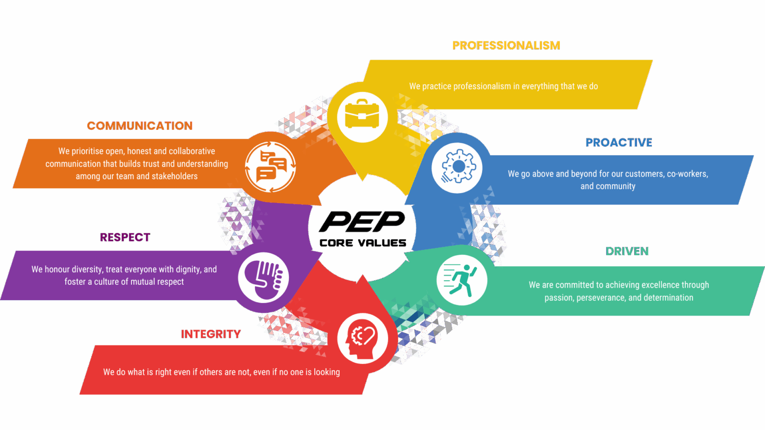 Communication, Professionalism. Driven. Proactive. Integrity. Respect.